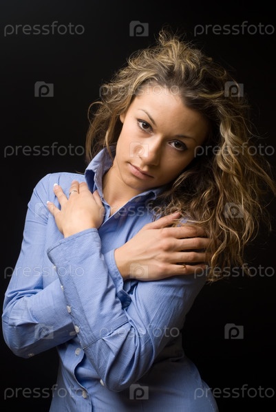 Красивая кавказская молодая женщина в синей рубашке с каштановыми вьющимися волосами на черном фоне