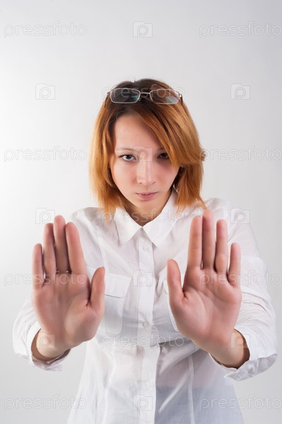 Красивая рыжеволосая деловая женщина делает стоп-жест на белом фоне
