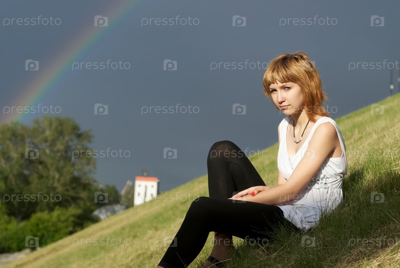 Красная молодая женщина сидит на зеленой траве в летний день над радугой после дождя