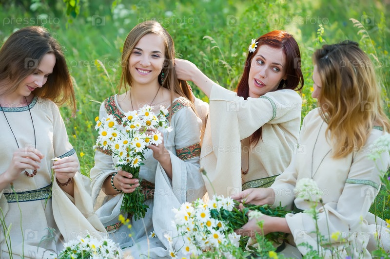 Привлекательные женщины в традиционной одежде расслабляются на фоне природы. Празднование Ивана Купалы