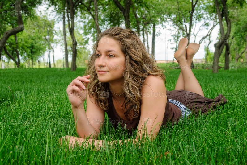 Молодая красивая улыбающаяся женщина расслабляется на траве
