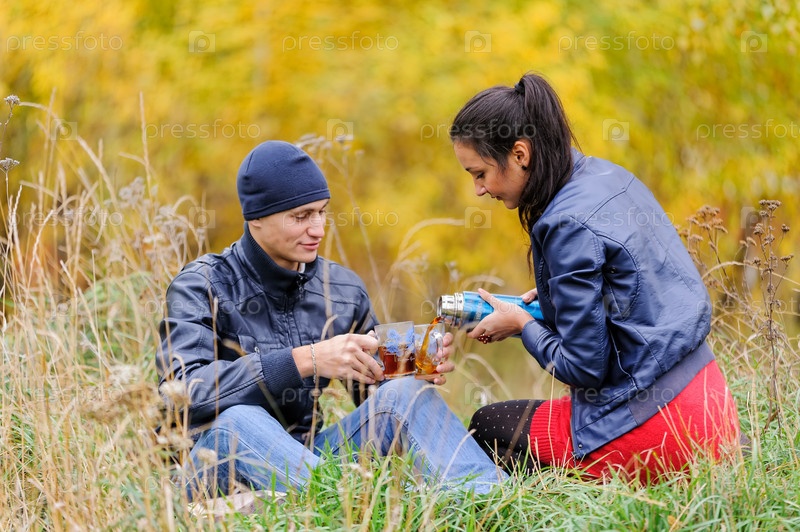 Молодая красивая пара влюбленных пьет чай в осеннем парке