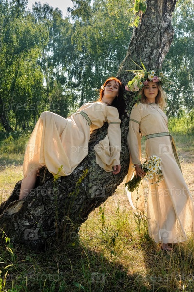Привлекательные женщины в традиционной русской одежде расслабляются на фоне природы. Празднование Ивана Купалы