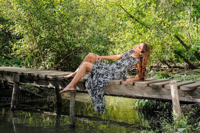 Привлекательная молодая женщина лежит на деревянном мосту на открытом воздухе