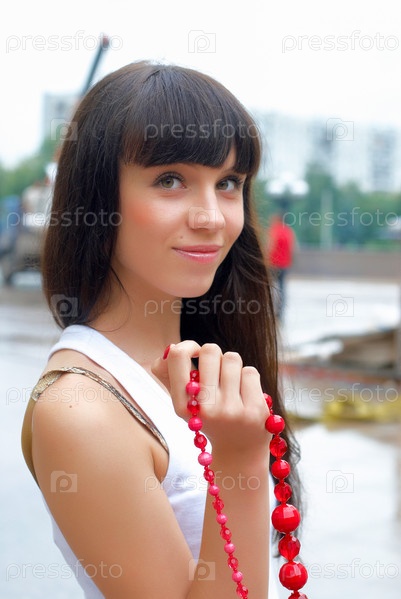 Привлекательная улыбающаяся женщина в белом платье с красными бусами на городском фоне после дождя