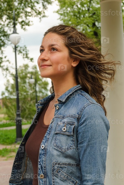 Молодая привлекательная брюнетка в коричневом платье в летнем парке