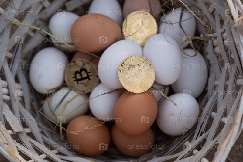Биткойн лежит в корзине с яйцами белой и коричневой травы между ними
