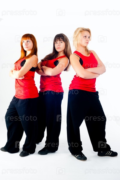 Три молодые красивые женщины танцуют хип-хоп на белом фоне