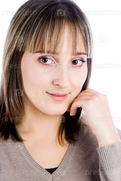 Молодая красивая женщина с загадочной улыбкой, изолированная на белом фоне