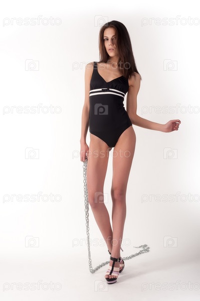 Красивая молодая женщина, стоящая с металлическими цепями на белом фоне