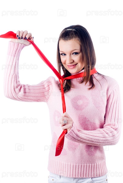 Молодая женщина играет с бюрократией на изолированном фоне