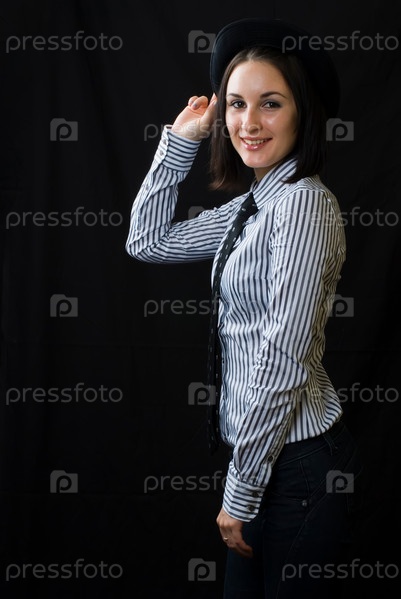 Молодая красивая женщина с галстуком, держащая шляпу над черным