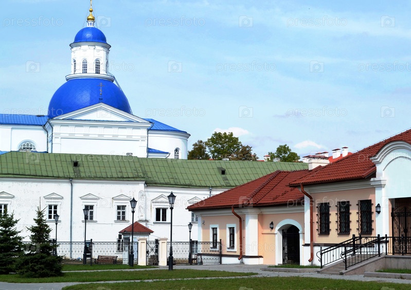Храм с голубым куполом и золотым крестом, монастырь и дом паломников
