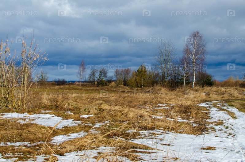 Пейзаж природы ранней весной в пасмурный день, тает снег на прошлогодней пожелтевшей сухой траве. Стройные березы без листьев и другие деревья качаются на ветру. Серые тучи