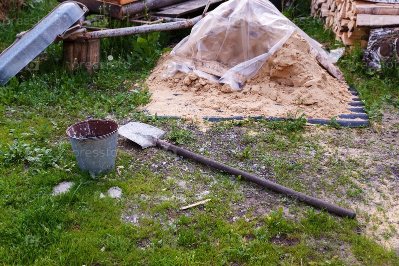 Лопата и ведро с песком на строительной площадке в деревне. Строительная площадка. Строительные инструменты