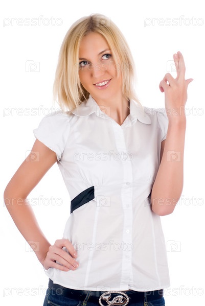Молодая привлекательная женщина показывает жест скрещенными пальцами на изолированном белом фоне