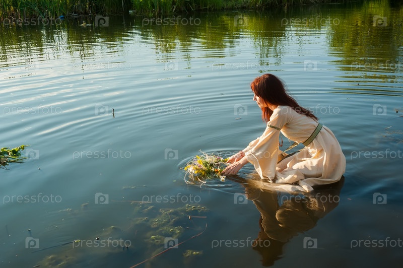 Красивая рыжеволосая девушка расслабляется в воде