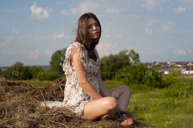 Портрет молодой привлекательной брюнетки сидит на стоге сена