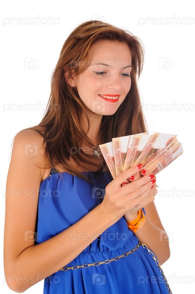 Привлекательная улыбающаяся девушка с веснушками охлаждается веером денег