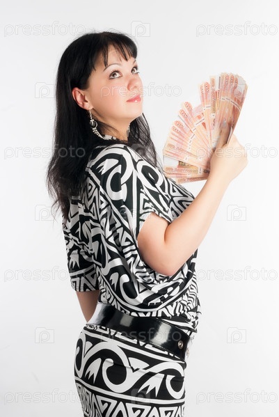 Молодая привлекательная женщина с валютой на белом фоне