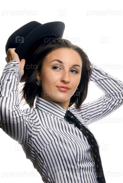 Молодая красивая женщина, держащая шляпу на изолированном белом фоне в студии