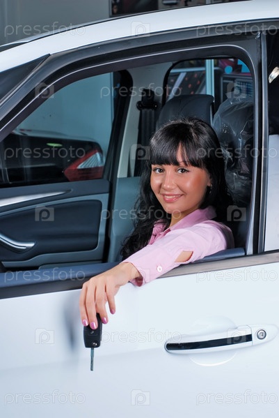 Молодая женщина держит ключи от новой машины и улыбается в камеру