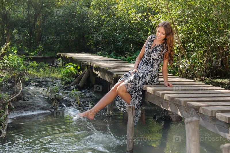 Красивая девушка расслабляется на пешеходном мосту