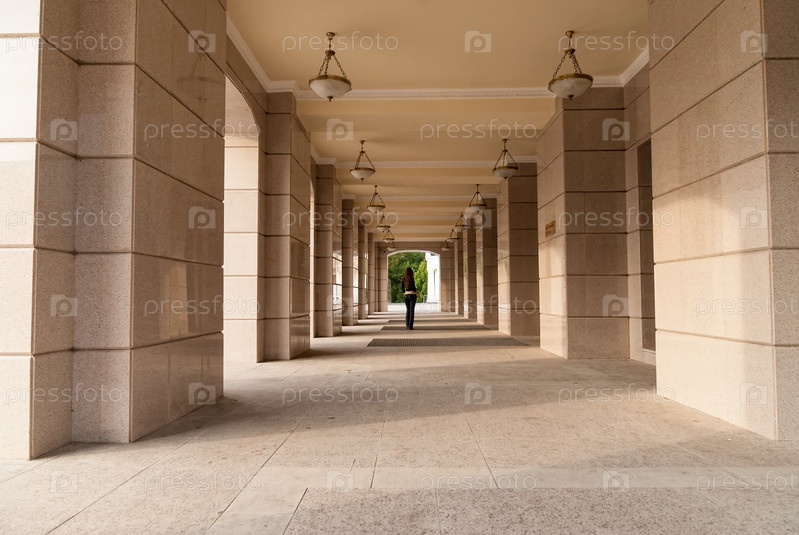 Молодая красивая женщина, стоящая возле городского театра
