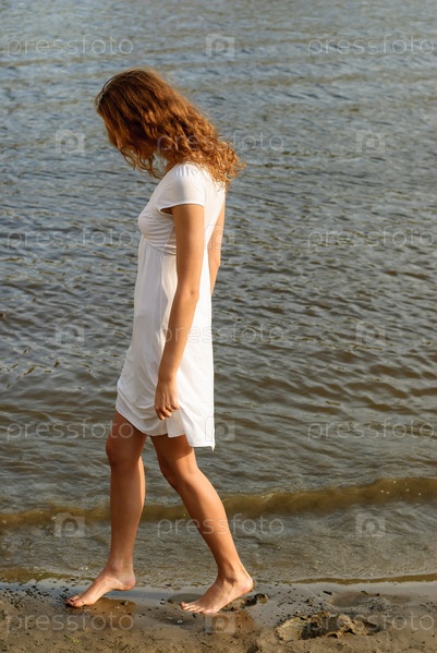 Красотка в белом платье на берегу