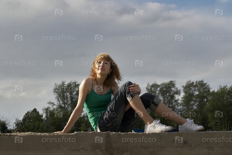 Молодая привлекательная рыжеволосая улыбающаяся женщина сидит на набережной реки
