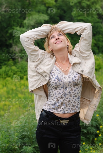 Привлекательная улыбающаяся женщина в летний день на фоне природы