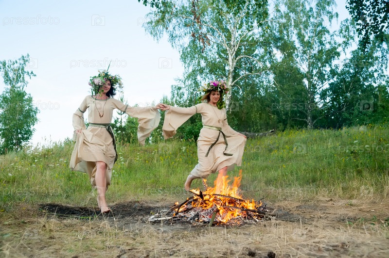Две красивые женщины с венком из цветов прыгают через костер. Празднование Ивана Купалы. Россия