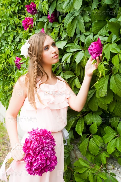 Портрет красивой брюнетки с прической цветка пиона. Модное фото