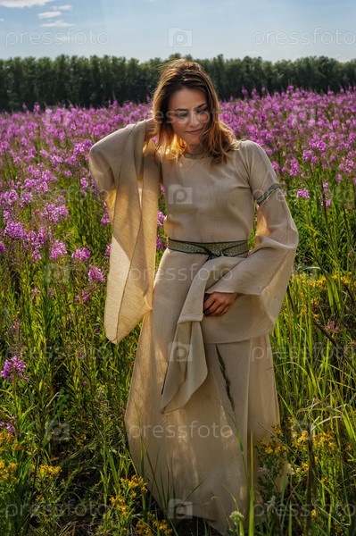 Красивая грустная женщина в традиционной одежде расслабляется с букетом цветов на лугу кипрея