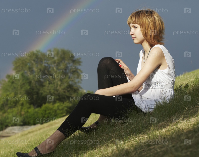 Молодая красивая женщина и радуга после дождя