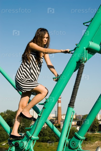 Привлекательная молодая женщина на строительном кране