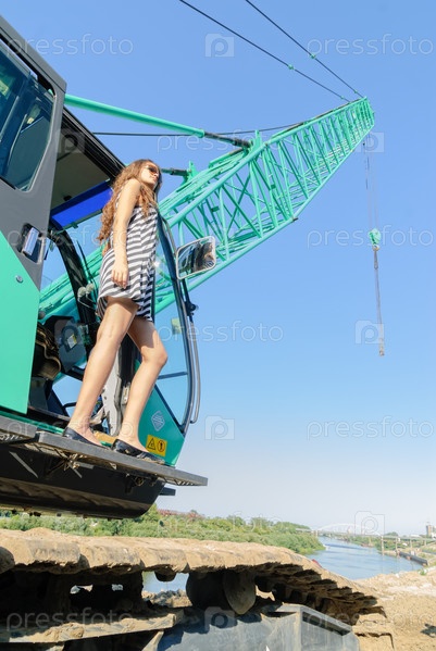 Привлекательная девушка в кабине строительного крана