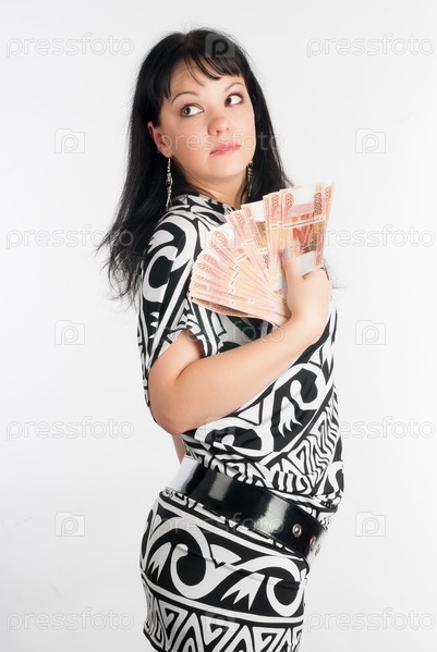 Молодая привлекательная женщина с валютой на белом фоне