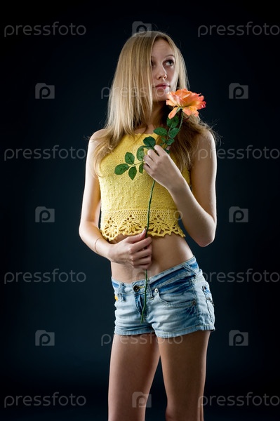 Молодая привлекательная женщина с цветком в студии на черном фоне