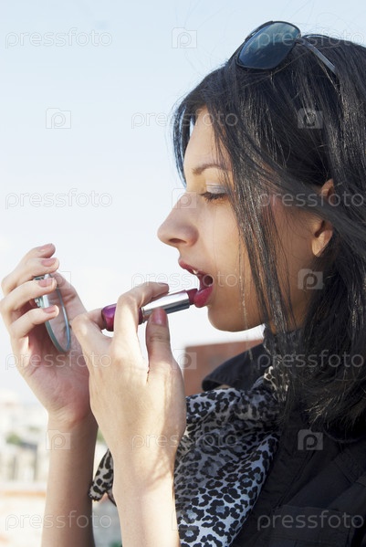 Портрет молодой красивой темноволосой женщины крупным планом, которая красит губы. Красивая женщина красит губы помадой
