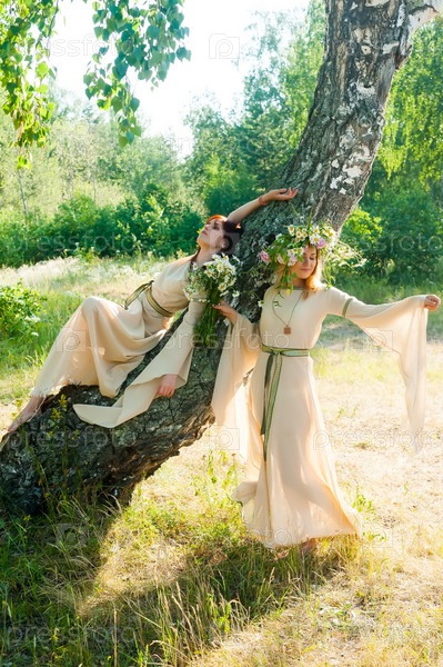 Привлекательные женщины в традиционной русской одежде расслабляются на фоне природы. Празднование Ивана Купалы