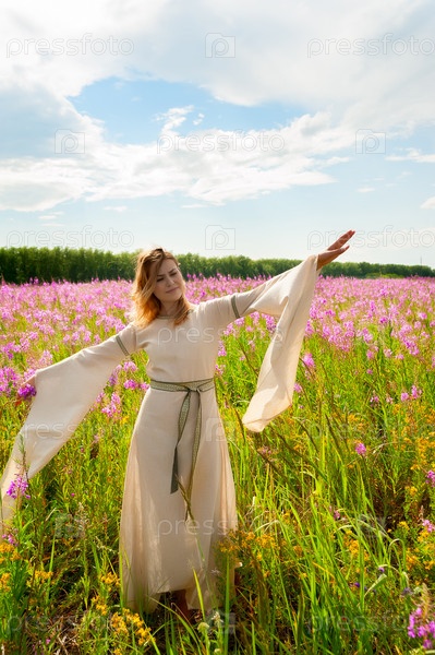 Красивая женщина в традиционной одежде отдыхает на кипрейном лугу