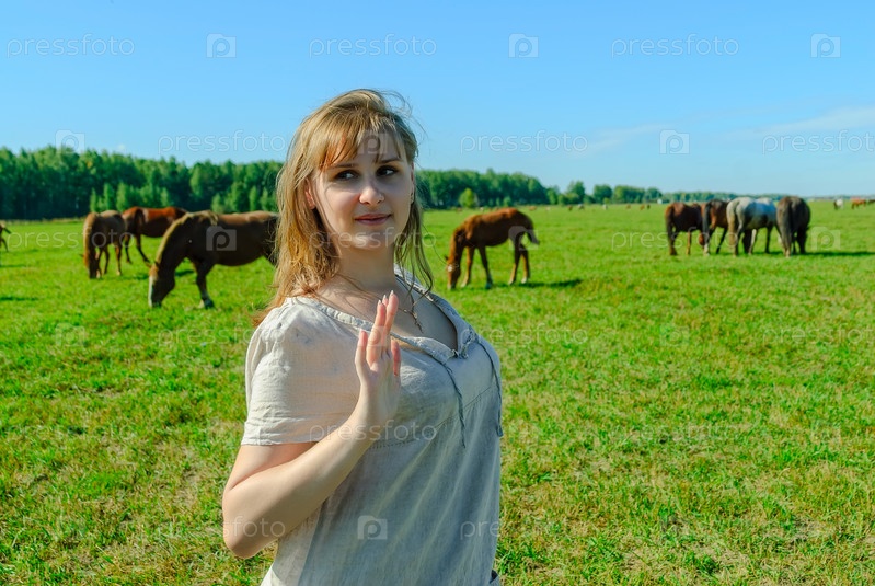 Красивая женщина в традиционной одежде отдыхает на лугу на фоне лошадей