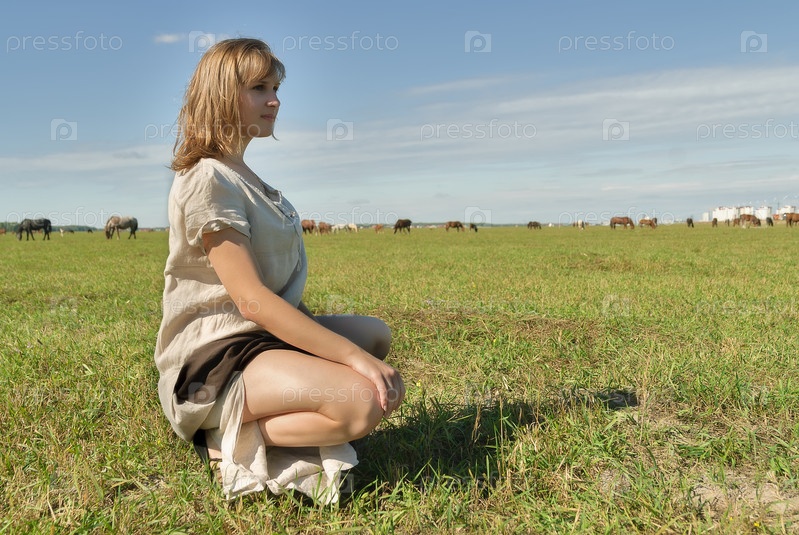Красивая женщина в традиционной одежде отдыхает на лугу на фоне лошадей