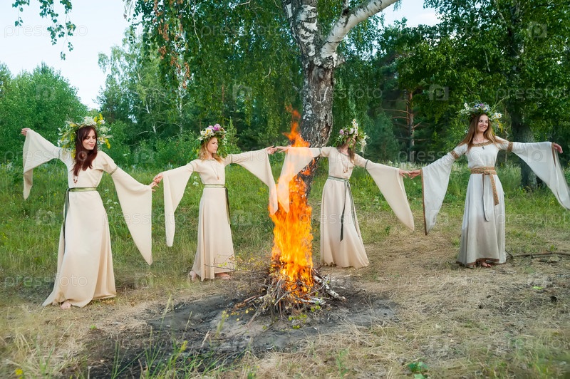 Четыре привлекательные женщины с венком из цветов танцуют вокруг костра. Празднование Ивана Купалы. Россия