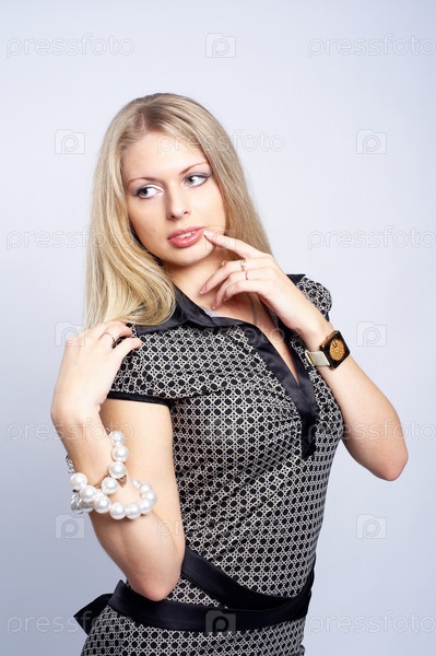 Портрет привлекательной молодой блондинки с бисером на белом фоне