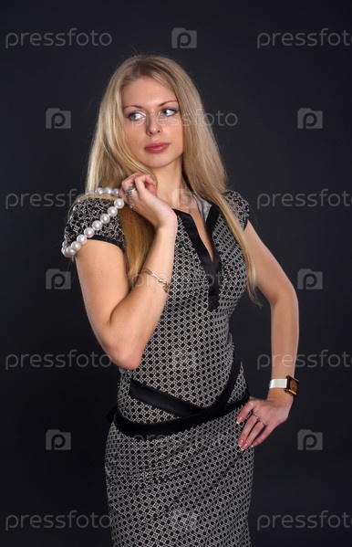 Портрет привлекательной молодой блондинки с бисером на черном фоне