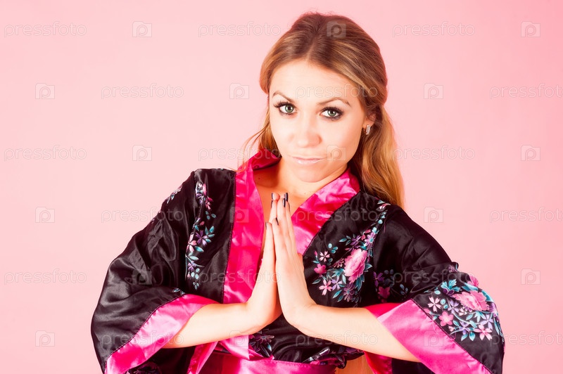 Молодая привлекательная женщина в японском кимоно на розовом фоне