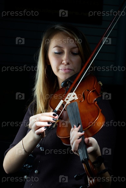 Молодая женщина играет на скрипке. Изолированные на черном фоне