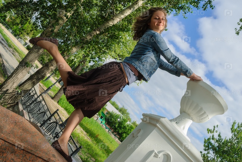 Женщина улыбается идеальной улыбкой и белыми зубами в парке и смотрит в камеру
